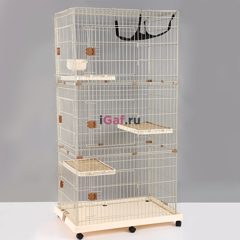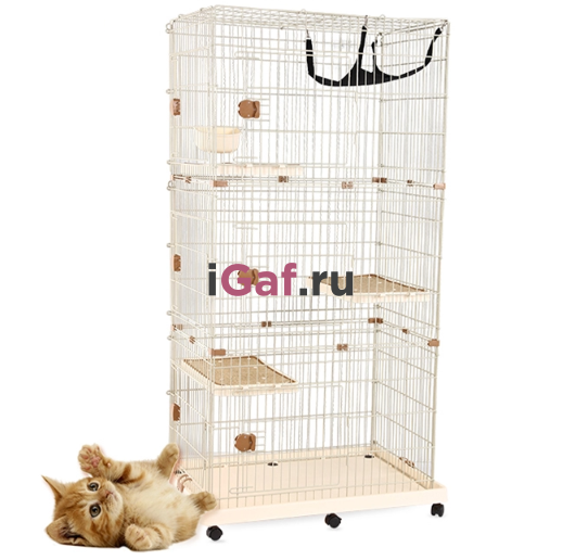 Клетка для кошек 3-х ярусная. Высокая и просторная, многоэтажная клетка. Легкое передвижение по комнате обеспечивают колеса не царапающие пол. Колеса вкручиваются внутрь ножек, при желании их можно не устанавливать. Расстояние между прутьями 3 см.