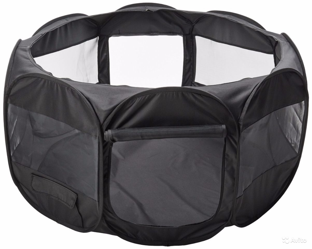 Тентовый вольер изготовлен из прочного водонепроницаемого материала, прекрасно подойдет для дома и улицы. Компактно складывается в небольшую сумку, удобно брать с собой в путешествия. Крыша сделана из прочной сетки, пристегивается на молнию. В одной из секций дверь.
